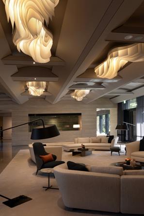 植物園的回憶 充滿舊時回憶的重慶南路上,以盛夏植物園裡盛裝露水的荷葉與牯嶺街文人寶藏的舊書頁為形式的發想。在各空間裡,燈具與懸浮的類燈具天花,點點光班與頁頁光漫都在模擬這些元素:仿書疊的信箱;餐食空間的圓籠與泳池的綠面水光與疊影,盛滿對在地的浮光掠影。 期待時間佇留在這些空間裡,也強調出這盛滿歷史記憶難得基地的特殊性。
