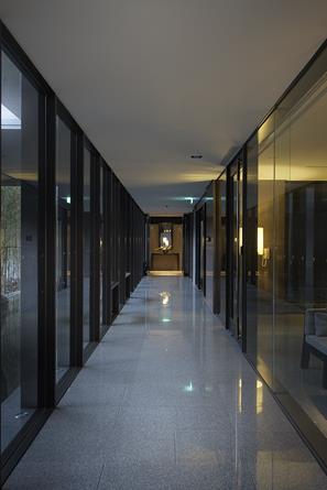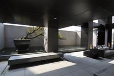 選擇由次要道路成為社區的主入口,面向主要道路側則僅設計一個寧靜的都市綠景, 回應嘈雜的商業街道,希望成為大隱於市的住宅社區。 開放無圍牆的正面⋯⋯透過水池與雕塑,過路者可以 望入社區內, 但藉由層疊的牆與壓低延伸的簷,透過水平垂直與階差漸昇之間, 達到彷如中國園林的轉進與深深的空間層次。